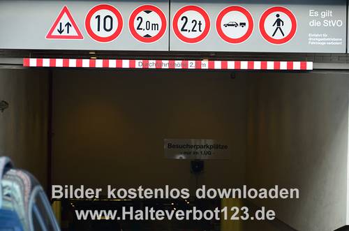 Einfahrt in ein Parkhaus mit oberhalb angebrachten Verkehrszeichen